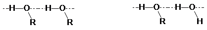 Спирты кипят при значительно более высокой температуре, чем, например, алканы с близкой или даже большей молекулярной массой (М): например, бутан С4H10 (М = 58) кипит при 4оС, а метиловый спирт СН3ОН (М = 32) - при 64оС. Это объясняется тем, что молекулы спиртов ассоциированы за счет образования водородных связей. Образование ассоциатов с водой объясняет высокую растворимость низших спиртов в воде. Ассоциаты спиртов имеют следующее строение: