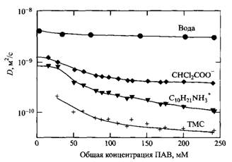 Как видно из рис., коэффициенты самодиффузии различных молекул сильно отличаются друг от друга при концентрациях ПАВ, значительно превышающих ККМ. Молекулы воды менее всего ассоциированы с мицеллами, тогда как молекулы TMC локализованы в мицеллах в гораздо большей степени. Результаты количественного анализа, вытекающие из измерений диффузии ПАВ и противоионов, представлены на рис.