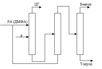 Все расчеты проводили на 1000 кг/час исходной смеси, содержащей 37% масс. ЦГ, 23% масс. бензола, 40% масс. толуола. Полагали также что поток РА содержит 99,96 масс. ДМФА и 0,04 масс. толуола, попадающего в поток РА вместе с рециклом из колонны регенерации.