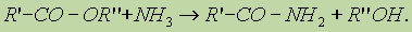 4. Реакция образования амидов. Под действием аммиака сложные эфиры превращаются в амиды кислот и спирты: