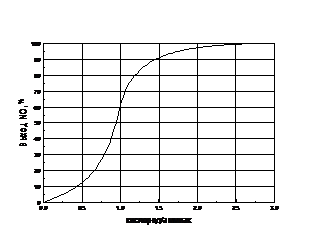 Таким образом, при использовании воздуха максимально возможной концентрацией аммиака в аммиачно-воздушной смеси, при которой достигается высокий выход NO, является 11,0–11,5%, и соотношение O2: NH3 = 1,7 при температурах 870 – 920 °С. На рис.3 представлена зависимость выхода NO от соотношения O2: NH3, в аммиачно-воздушной смеси. Для получения высокого выхода NO необходим примерно 30% -ный избыток кислорода сверх стехиометрического. Это связано с тем, что поверхность платинового катализатора должна быть постоянно насыщена кислородом (в отсутствие кислорода аммиак уже при 500 °С начинает разлагаться на азот и кислород).