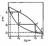 Нагрев исходную смесь состава х1 до температуры кипения получим находящийся в равновесии с жидкостью пар (точка b). Отбор и конденсация этого пара дают жидкость состава x2, обогащенную низкокипящим компонентом (х2 > х1). Нагрев эту жидкость до температуры кипения t2 , получим пар (точка d), конденсация которого дает жидкость с еще большим содержанием низкокипящего компонента, имеющую состав ха, и т. д. Проводя, таким образом, последовательно ряд процессов испарения жидкости и конденсации паров, можно получить в итоге жидкость (дистиллят), представляющую собой практически чистый низкокипящий компонент.