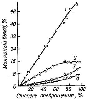 Рисунок 8 − Зависимость выхода основных продуктов превращения метилциклопентана от степени его превращения.